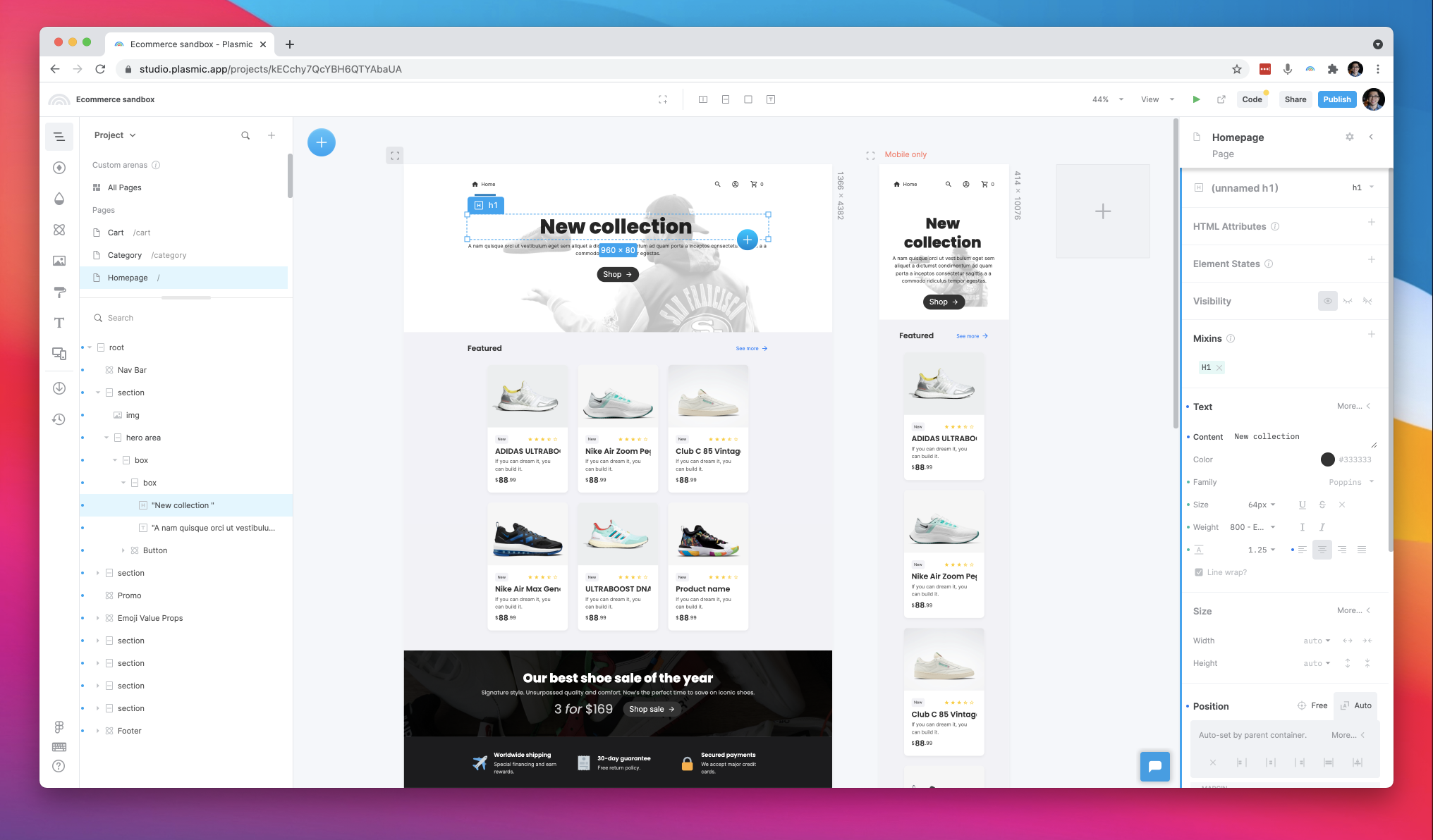 Create bespoke landing pages and any other free-form content in record time, using Plasmic's best-in-class web design tool. Use dynamic data from any data source, or use Plasmic's built-in headless CMS.